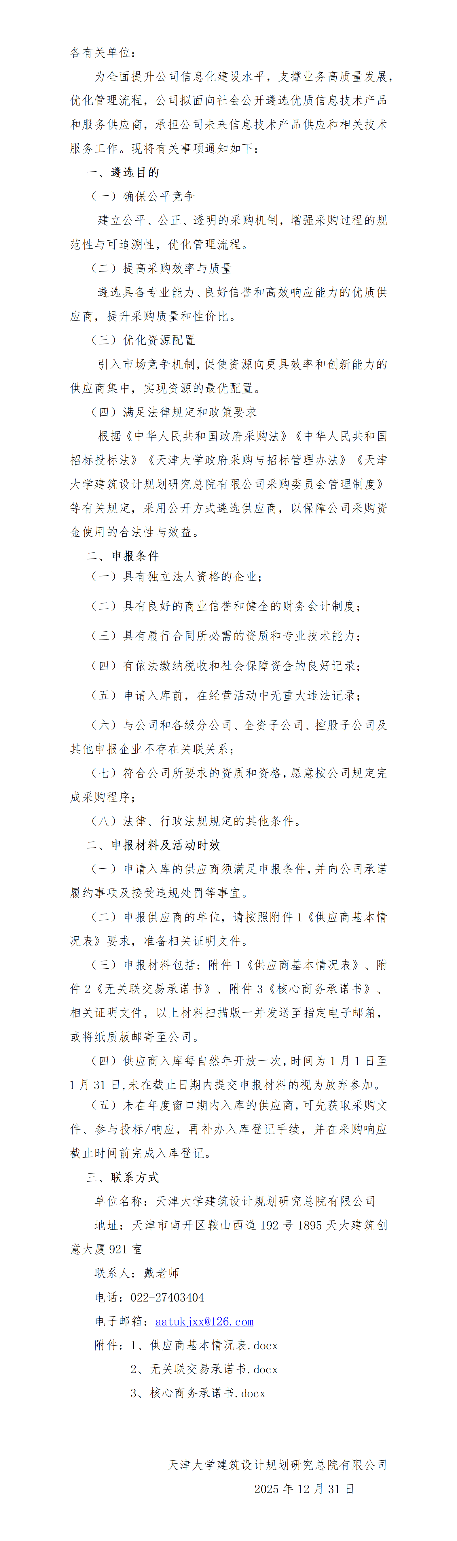 天津大学建筑设计规划研究总院有限公司关于遴选信息化供应商的通知