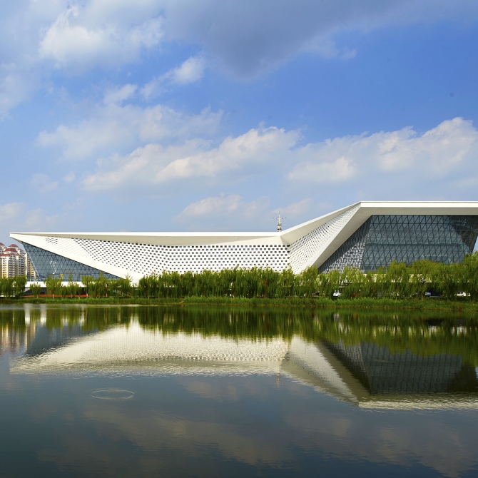 建筑师采用相对纯净包容的整体设计手法,将复杂的结构体系包含其中,利用新型建材的可塑性强的特点,进行折叠、拉伸,以中国传统折纸的手法使其显得轻巧活泼,与复杂的结构体系形成对比。建筑有着及其韵律感的外窗,不但保证建筑表面动感的效果,也保证纯净建筑体量效果不会过于呆板。GFRC外墙在建筑实体的内核之外形成半透明空间,其间布置观众通道所必须的交通设施,通往室外大平台和楼梯穿插其间,给行走期间的人们一种难以忘怀的体验。