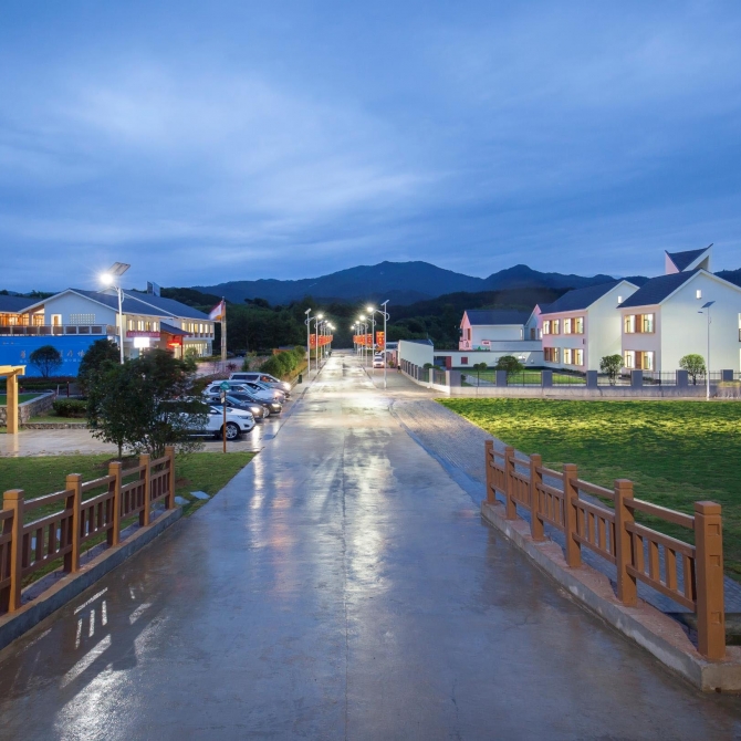 主要包括综合服务中心和小学(含幼儿园),设计均采取化整为零的方法,通过体量打散使建筑尺度和布局肌理接近于临近的聚落组团,尺度宜人的檐下、外廊及庭院空间,为使用者提供游憩与交流的场所。立面取自传统民居风格,开窗兼顾功能需要与景观视线,墙面采用实用经济的浅色涂料,屋顶采取与农宅相同的深黑色釉面瓦。室外景观尊重现有地形,尽量采用地方材料和植被,模拟自然的梯田景观,使建筑同乡村环境自然地融为一体。